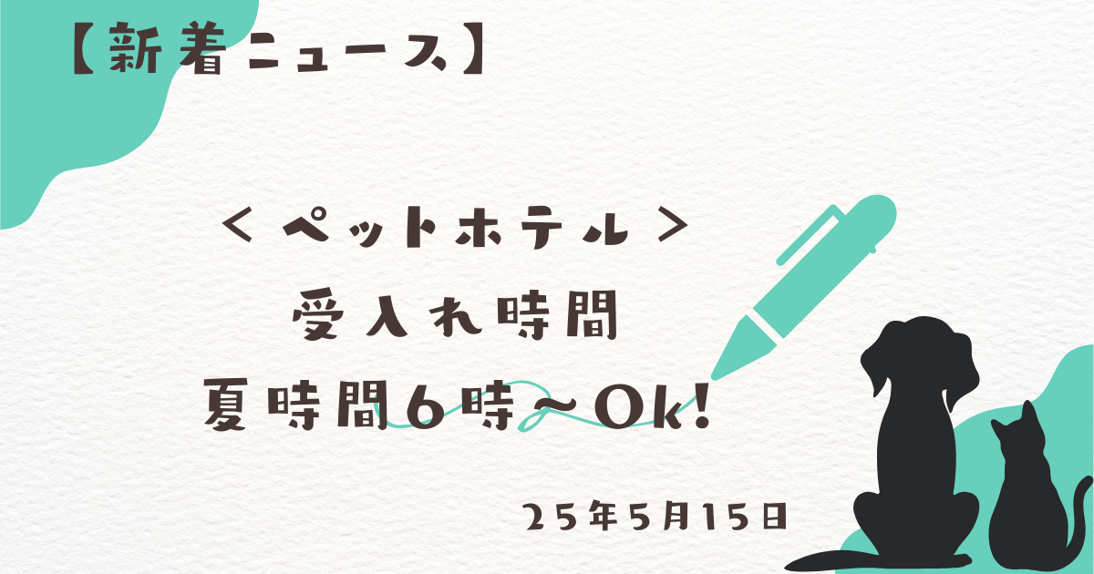 <ペットホテル>6時から受入れOK! 2025 5/15 新着ニュース 2025年5月13日2025年5月15日 夏時間に合せて、6月1日より受入れ時間を7時→6時に繰り上げました。ご旅行などの時間に合せてお早目のお預りOKです。お迎えのお時間は変わらず20時までとなっています。(早朝、深夜料金での対応もございます) 新着ニュース よかったらシェアしてね! URLをコピーしました! URLをコピーしました! <訪問介護>サービスエリア更新! この記事を書いた人 pcb-academy 関連記事 <訪問介護>サービスエリア更新! 2025年5月10日 <トリミング>新しいシャンプー剤導入しました! 2025年5月1日 GWご予約はお早めに! 2025年4月30日 コメント コメントする コメントをキャンセルコメント ※ 名前 ※ メール ※ サイト 次回のコメントで使用するためブラウザーに自分の名前、メールアドレス、サイトを保存する。